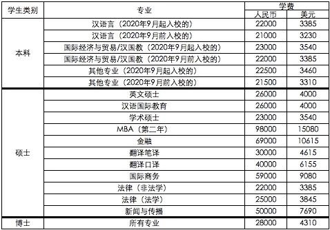 汉语言进修线下课程人民币10000元/学期(美元1539);线上课程8000元/学期(美元1231)